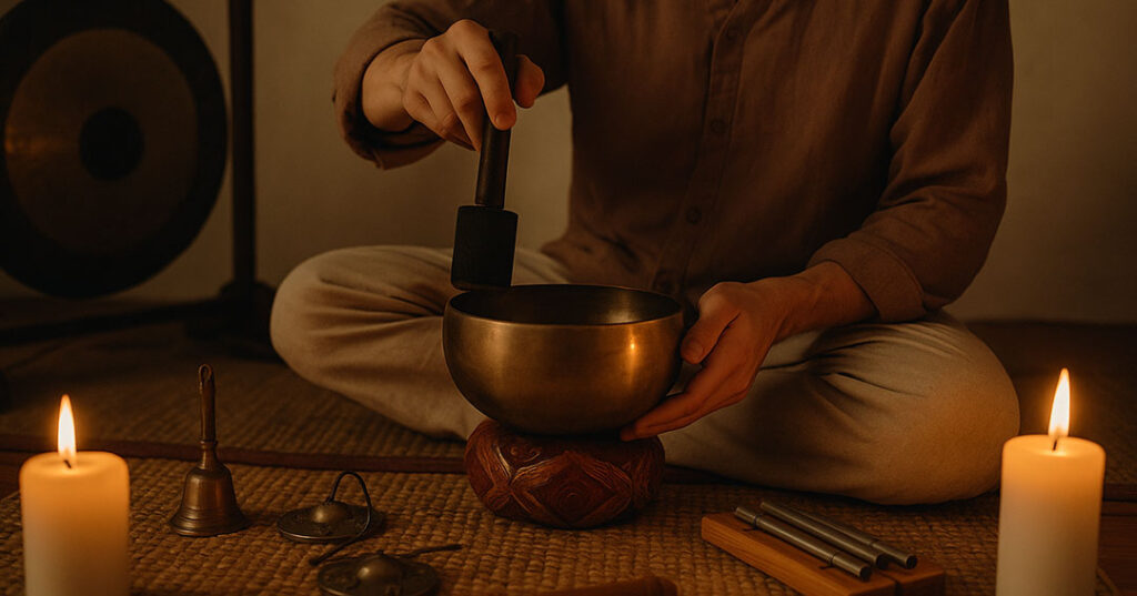 Avant le rituel, il est conseillé de consacrer un moment à l’accordage ou au nettoyage des instruments (physiquement et symboliquement). Certains pratiquants passent un chiffon imprégné d’eau salée sur leurs bols, ou méditent en tenant le tambour pour « lui confier » l’intention. D’autres utilisent de l’encens ou de la sauge pour purifier l’espace et invoquer une atmosphère sacrée (voir lithothérapie et purification si l’on intègre aussi des pierres).